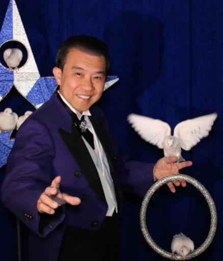 ハト、カード、シルク等を素材にフインガーテクニックと音楽が一体となった華麗な技で観客を引きつける
